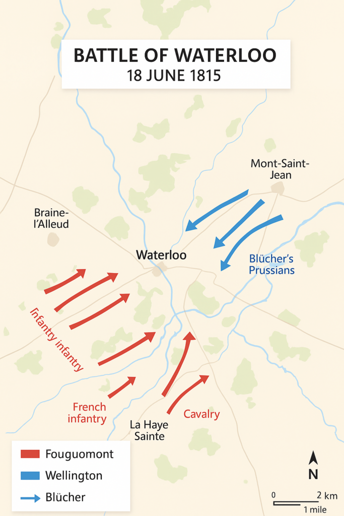 Bitka pri Waterloo, ktorá sa odohrala 18. júna 1815 na území dnešného Belgicka, patrí k najznámejším vojenským stretom v európskej histórii. Predstavovala posledný pokus Napoleona Bonaparta obnoviť svoju moc po návrate z vyhnanstva a zároveň rozhodujúce víťazstvo spojeneckých síl pod velením vojvodu z Wellingtonu a maršala Blüchera. Tento boj definitívne ukončil obdobie napoleonských vojen a otvoril novú kapitolu v dejinách Európy.